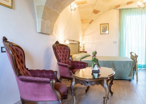 Ogni camera, riprende lo stile tipico delle vecchie masserie del Salento: sovrastata da volte a stella, è dotata di bagno privato interno con doccia e arredata con un letto intarsiato in legno e materassi costruiti su misura, per offrirti un soggiorno all’insegna del comfort e del relax.